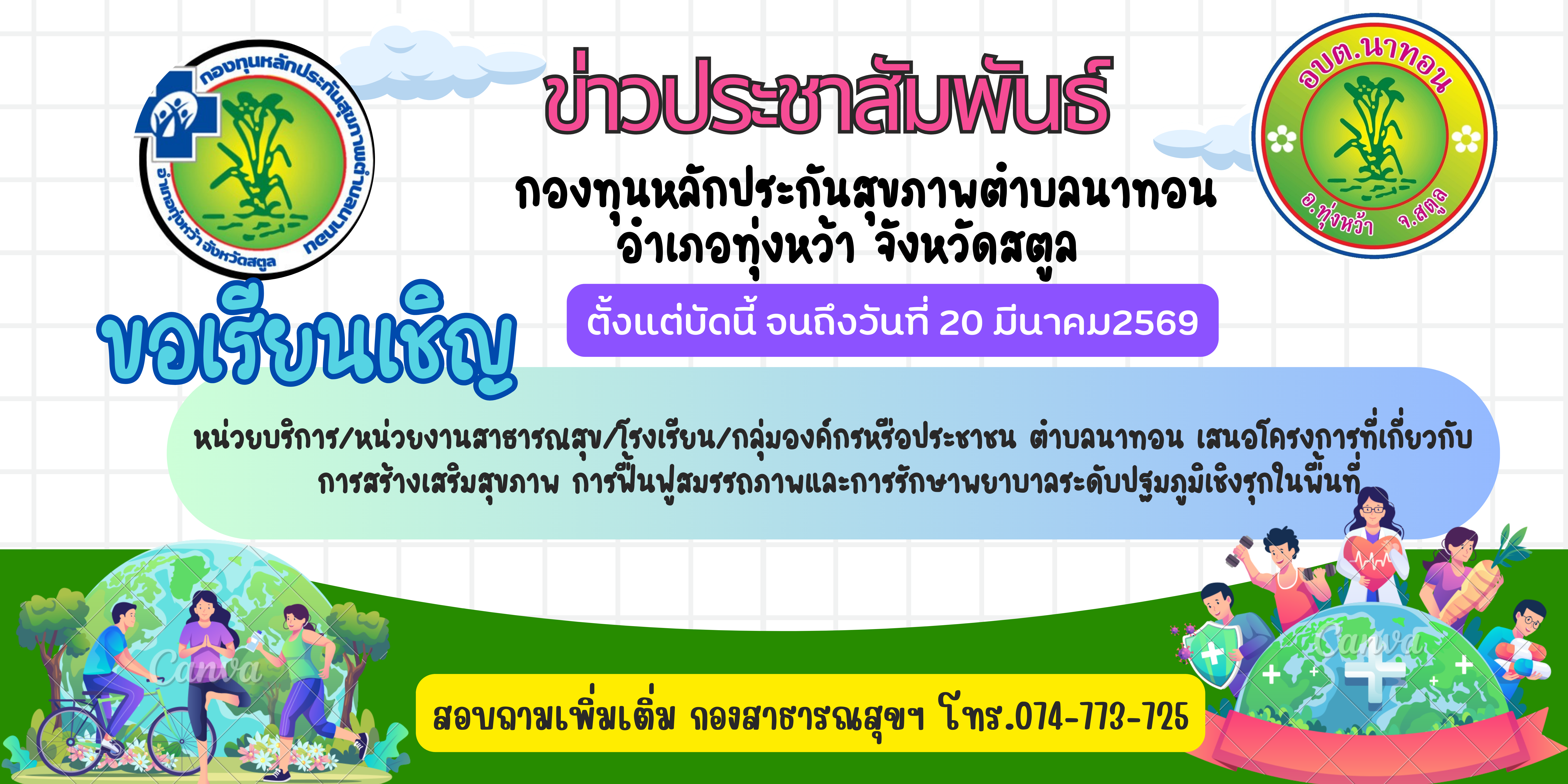 กองทุนหลักประกันสุขภาพตำบลนาทอน เปิดรับ ข้อเสนอโครงการด้านสุขภาพ เพื่อร่วมพัฒนาคุณภาพชีวิตของพี่น้องตำบลนาทอน |