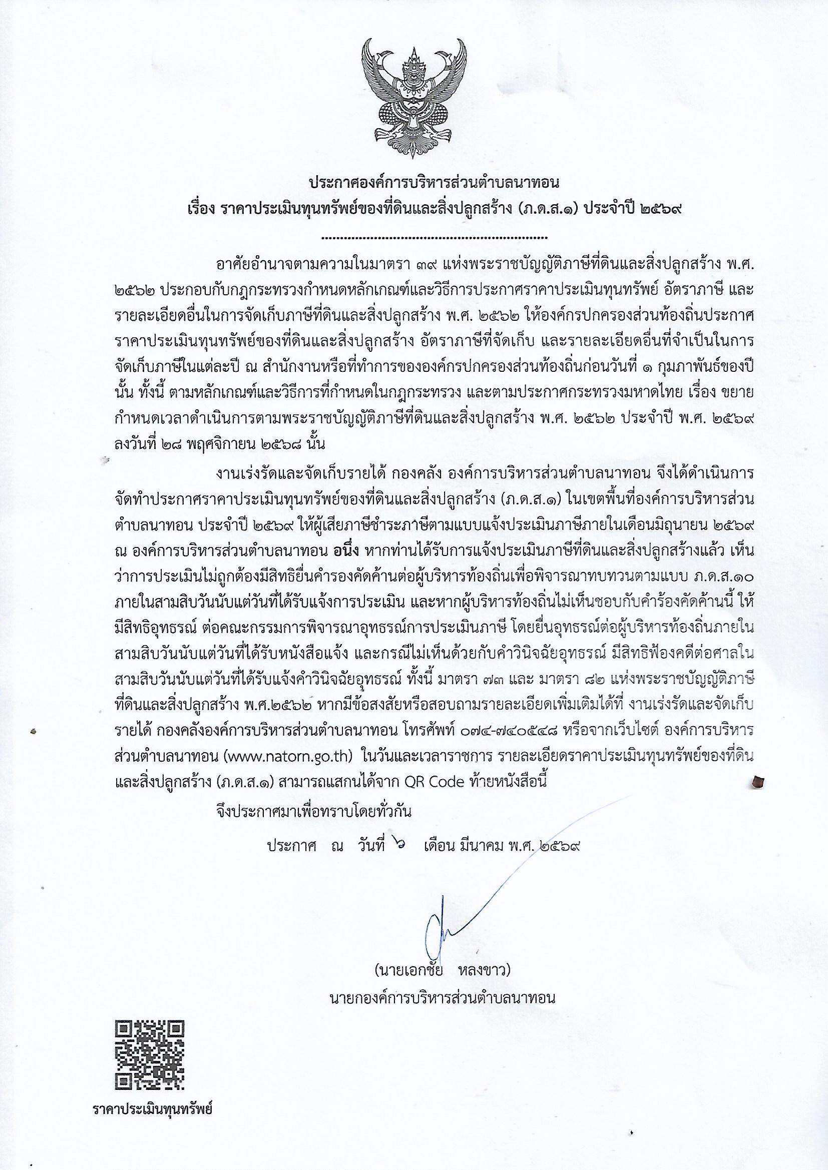 ประกาศองค์การบริหารส่วนตำบลนาทอน เรื่องราคาประเมินทุนทรัพย์ของที่ดินและสิ่งปลูกสร้าง (ภ.ด.ส.1) ประจำปี พ.ศ. 2569 ตามพระราชบัญญัติภาษีที่ดินและสิ่งปลูกสร้าง พ.ศ. 2562 |