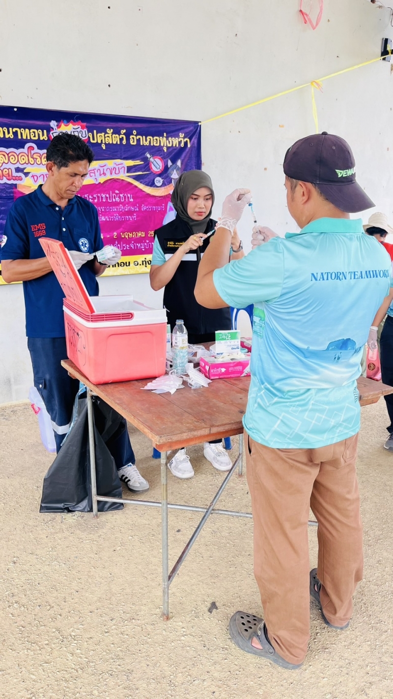 #นายเอกชัย หลงขาว นายกองค์การบริหารส่วนตำบลนาทอน มอบหมายเจ้าหน้าที่องค์การบริหารส่วนตำบลนาทอน พร้อมด้วยปศุสัตตว์อำเภอทุ่งหว้า ลงพื้นที่ฉีดวัคซีนโรคพิษสุนัขบ้าให้กับสุนัขและแมวในพื้นที่หมู่ที่ 3 บ้านช่องไทร โดยมีประชาชน นำสุนัขและแมว มารับบริการ จำนวน 43 ตัว