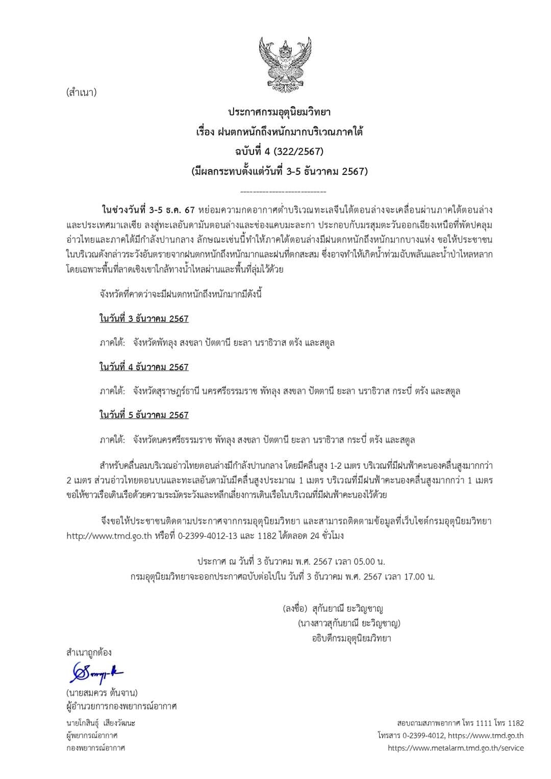 ประกาศกรมอุตุนิยมวิทยา เรื่อง อากาศแปรปรวนบริเวณประเทศไทย ฉบับที่ 8 (315/2568) |