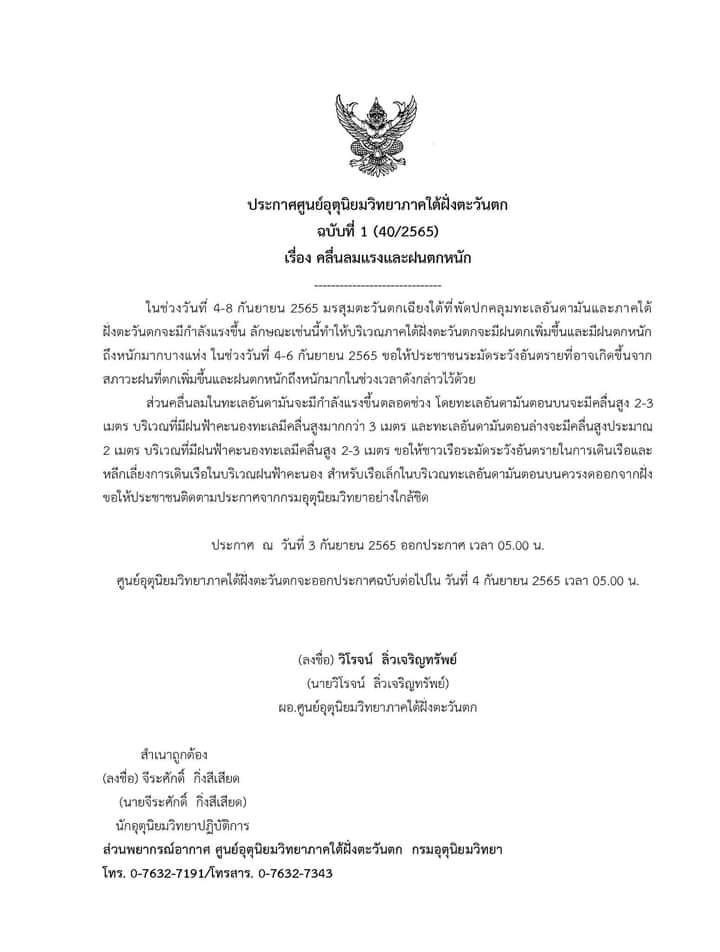 ประกาศศูนย์อุตุนิยมวิทยาภาคใต้ฝั่งตะวันตก ฉบับที่ 6 (37/2568) เรื่อง ฝนตกหนักและคลื่นลมแรงบริเวณทะเลอันดามัน ในช่วงวันที่ 10 -11 มิถุนายน 2568 |
